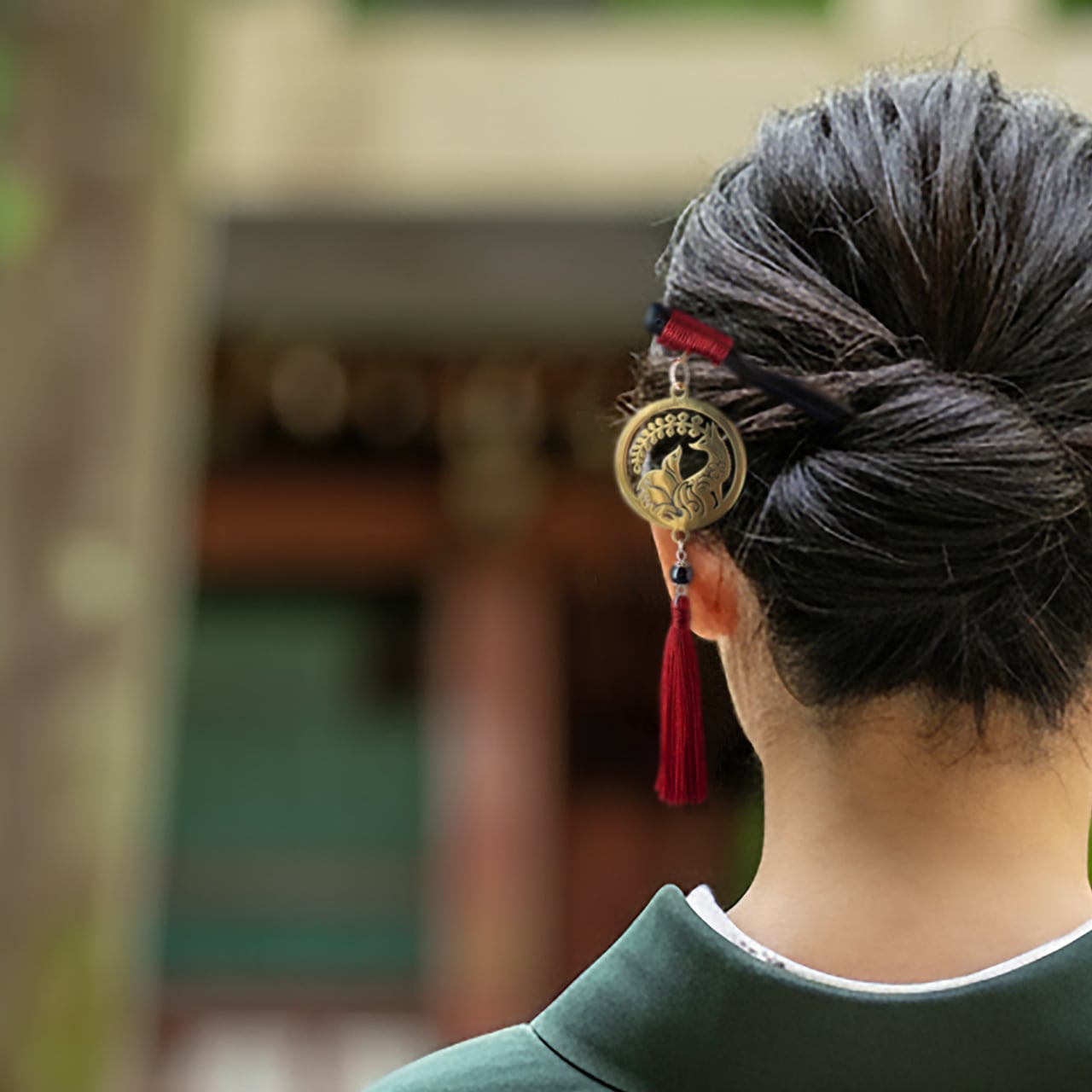 九尾の狐 二条藤紋の木製かんざし シルバー