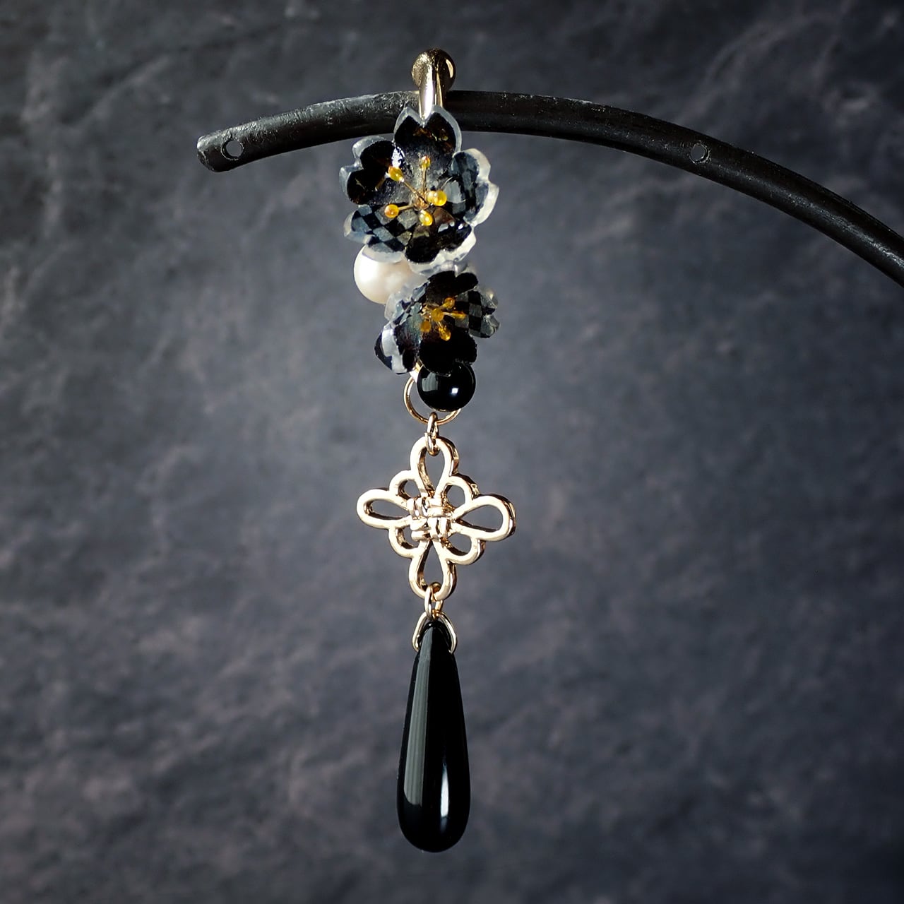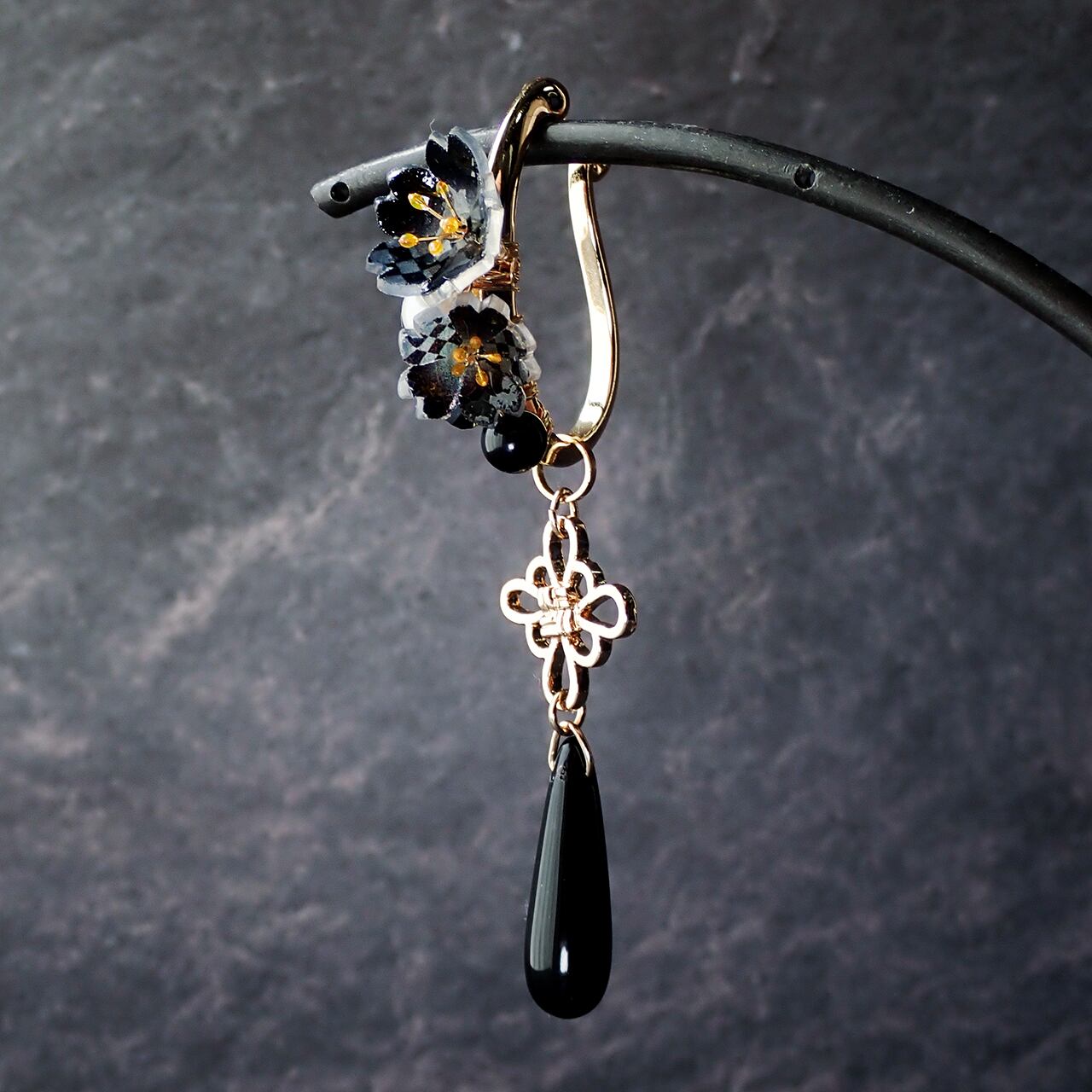 夜の闇に浮かび上がるような黒い桜に、縁起の良い「吉祥結び」を合わせた、お守りのようなイヤーカフです。