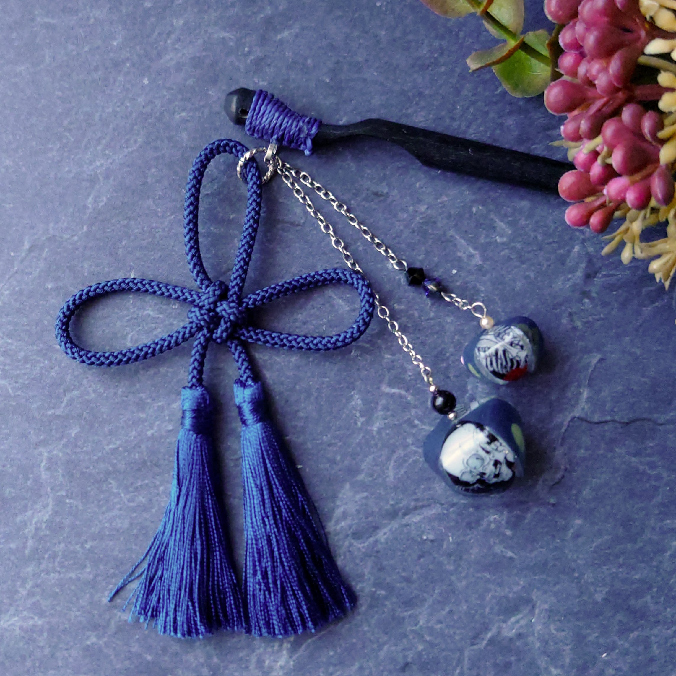素材:プラバン・メッキ金具・オニキス・チェコガラスパール・ヨーロッパ産高品質クリスタル・絹糸・アジアンコード・ワックスコード・レジン・木製(かんざし本体)